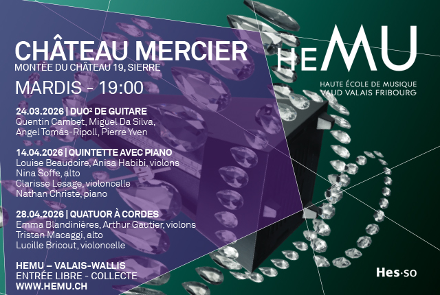 Ses espaces et ses jardins remarquables en font un lieu reconnu pour l’organisation d’événements et de concerts. L’HEMU – Valais-Wallis y propose chaque année quelques concerts dans le hall d’entrée, un espace singulier orné d’œuvres picturales valaisannes emblématiques.Programme24.03.2026 - Duos de guitareQuentin Cambet et Miguel Da SilvaAngel Tomás-Ripoll et Pierre Yvem14.04.2026 - Quintette avec pianoLouise Beaudoire, violon | Anisa Habibi, violon | Nina Soffe, alto | Clarisse Lesage, violoncelle | Nathan Christe, piano28.04.2026 - Quatuor à cordesEmma Blandinières, violon | Arthur Gautier, violon | Tristan Macaggi, alto | Lucille Bricout, violoncelle