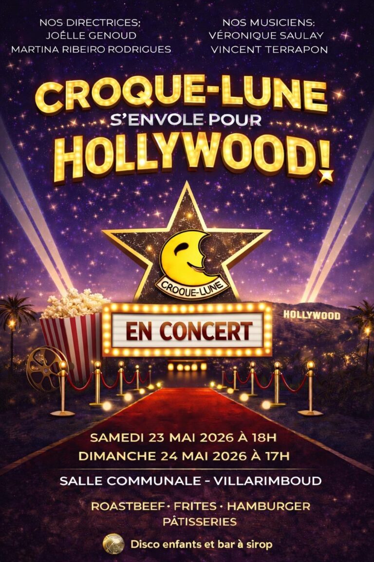 À travers un concert mêlant chant, mise en scène et touches d’humour, les enfants vous emmènent dans l’univers du cinéma et du spectacle. Inspiré de l’ambiance hollywoodienne, ce moment festif propose un joli mélange de chansons, d’interprétations et de clins d’œil au monde du grand écran.Entre énergie, émotions et créativité, petits et grands sont invités à partager une soirée conviviale, rythmée et pleine de surprises.Restauration : Roasbeef Frites Hambruger PâtisserieDisco enfants et bar à siropLieu : Salle Communale de Villarimboud1690 Villarimboud Lieu : Salle Communale de Villarimboud1690 Villarimboud