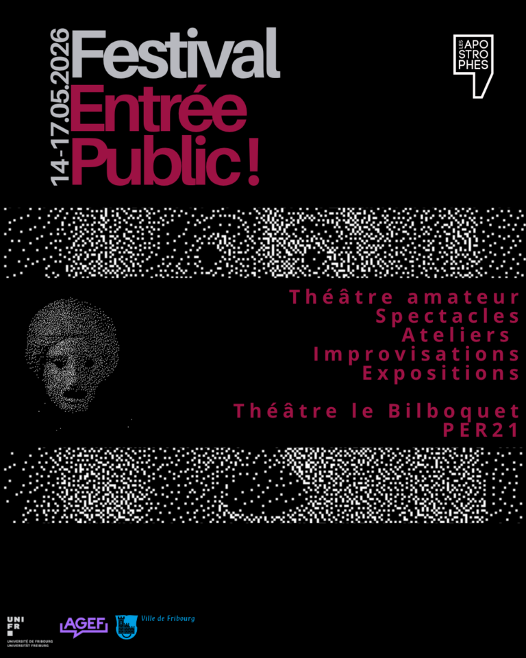 Entrée Public! est un festival de théâtre amateur durant lequel plusieurs troupes romandes et fribourgeoises, notamment la troupe de l'Université de Fribourg, présentent leurs projets. Il se déroule du 14 au 17 mai et est ouvert à tous les amateurs de théâtre ou curieux intéressés par le 6ème art ! Un chapeau sera présenté à la sortie de chaque pièce