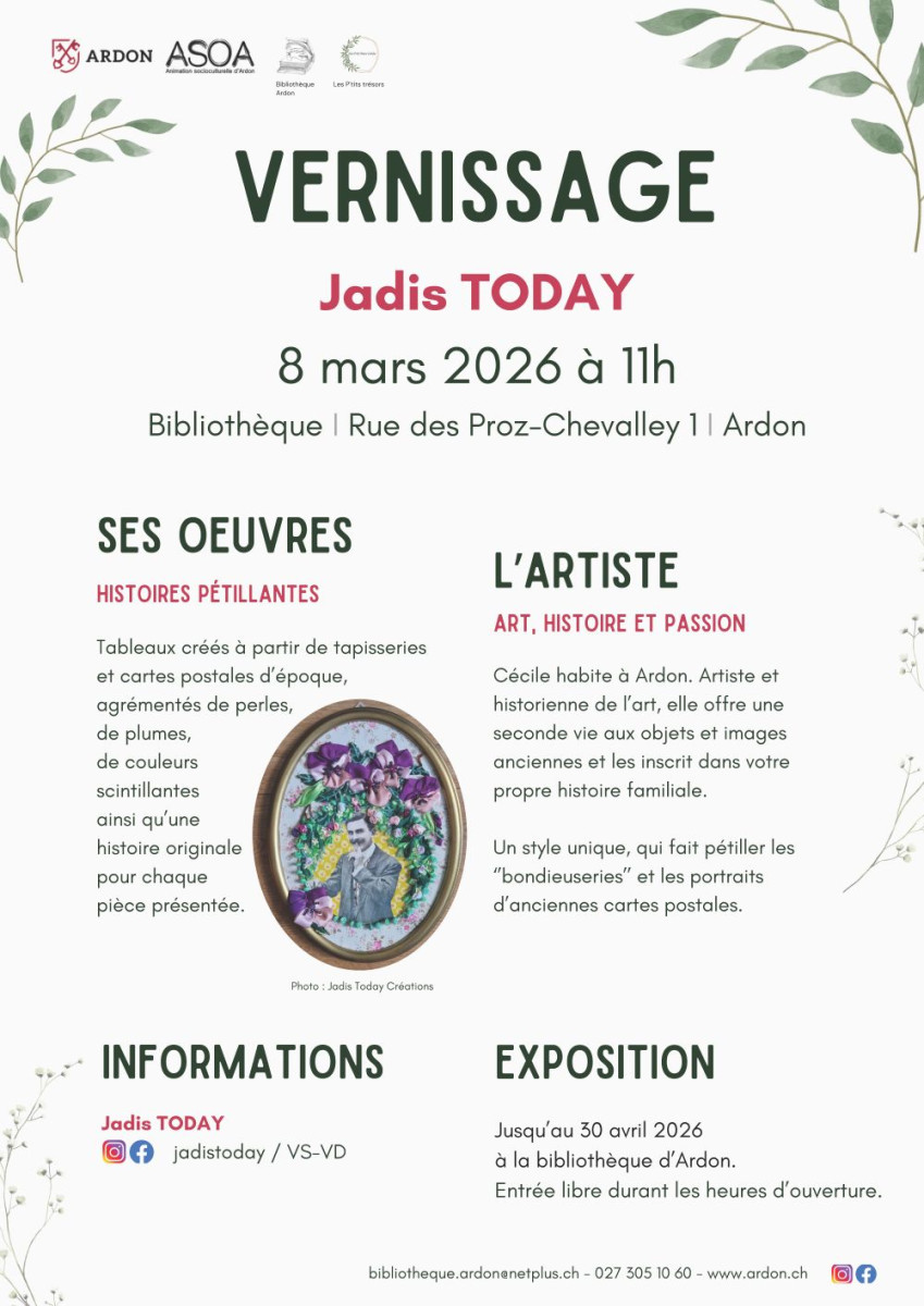 Cécile habite à Ardon. Artiste et historienne de l'art, elle offre une seconde vie aux objets et images anciennes et les inscrit dans votre propre histoire familiale.A travers cette exposition, découvrez des tableaux créés à partir de tapisseries et cartes postales d'époque, agrémentés de perles, de plumes, de couleurs scintillantes ainsi qu'une histoire originale pour chaque pièce présentée.Entrée libre durant les heures d'ouverture de la bibliothèque.Vernissage en présence de l'artiste.
