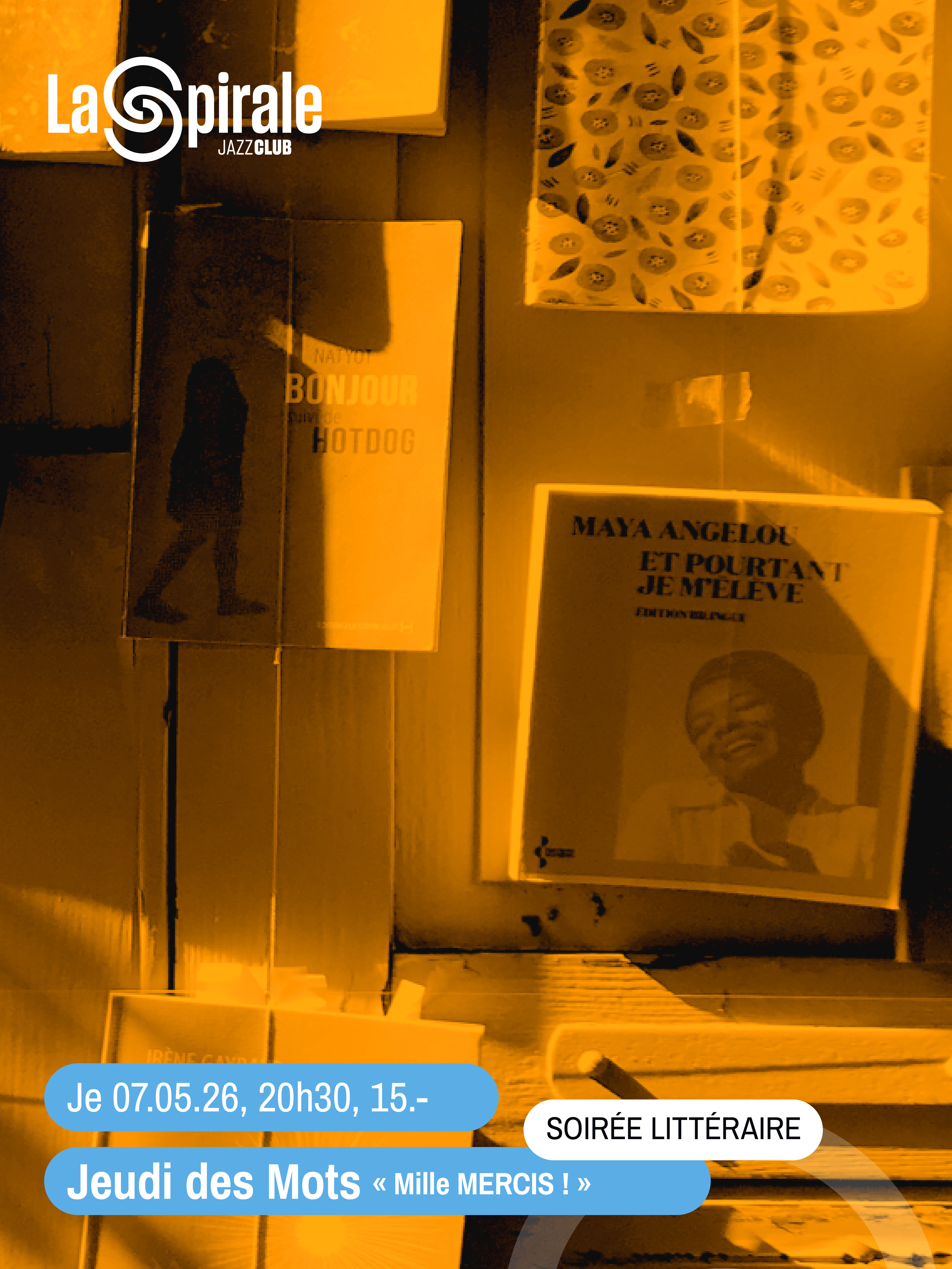 Chaque premier jeudi du mois, La Spirale se transforme en salon littéraire convivial, entre lectures, découvertes et coups de cœur partagés autour d’une autrice ou d’un univers, Retrouvez toutes les informations sur JEUDI DES MOTS « Mille MERCIS », dès le 07.05.2026 à 20:30, La Spirale, Fribourg sur Tempslibre.ch ainsi que tous les autres Manifestations dans le canton de Fribourg et en Suisse Romande
