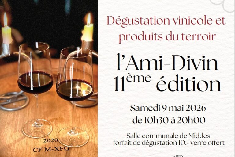 La 11ème édition de la journée de dégustation de l'Ami Divin se déroulera le 09 mai 2026 à la salle communale de Middes/FR Restauration toute la journée Adresse : Salle communale de MiddesGrand-Clos 101749 Middes Une navette gratuite est à votre disposition sur demande au départ des gares d'Avry-Matran (arrêt de bus du centre commercial) , Payerne et Romont Téléphone : 079/790.76.50 Une navette gratuite est à votre disposition sur demande au départ des gares d'Avry-Matran (arrêt de bus du centre commercial) , Payerne et Romont Téléphone : 079/790.76.50 Une navette gratuite est à votre disposition sur demande au départ des gares d'Avry-Matran (arrêt de bus du centre commercial) , Payerne et Romont Téléphone : 079/790.76.50 Une navette gratuite est à votre disposition sur demande au départ des gares d'Avry-Matran (arrêt de bus du centre commercial) , Payerne et Romont Téléphone : 079/790.76.50 Une navette gratuite est à votre disposition sur demande au départ des gares d'Avry-Matran (arrêt de bus du centre commercial) , Payerne et Romont Téléphone : 079/790.76.50 Une navette gratuite est à votre disposition sur demande au départ des gares d'Avry-Matran (arrêt de bus du centre commercial) , Payerne et Romont Téléphone : 079/790.76.50 Une navette gratuite est à votre disposition sur demande au départ des gares d'Avry-Matran (arrêt de bus du centre commercial) , Payerne et Romont Téléphone : 079/790.76.50 Une navette gratuite est à votre disposition sur demande au départ des gares d'Avry-Matran (arrêt de bus du centre commercial) , Payerne et Romont Téléphone : 079/790.76.50 Une navette gratuite est à votre disposition sur demande au départ des gares d'Avry-Matran (arrêt de bus du centre commercial) , Payerne et Romont Téléphone : 079/790.76.50 Une navette gratuite est à votre disposition sur demande au départ des gares d'Avry-Matran (arrêt de bus du centre commercial) , Payerne et Romont Téléphone : 079/790.76.50