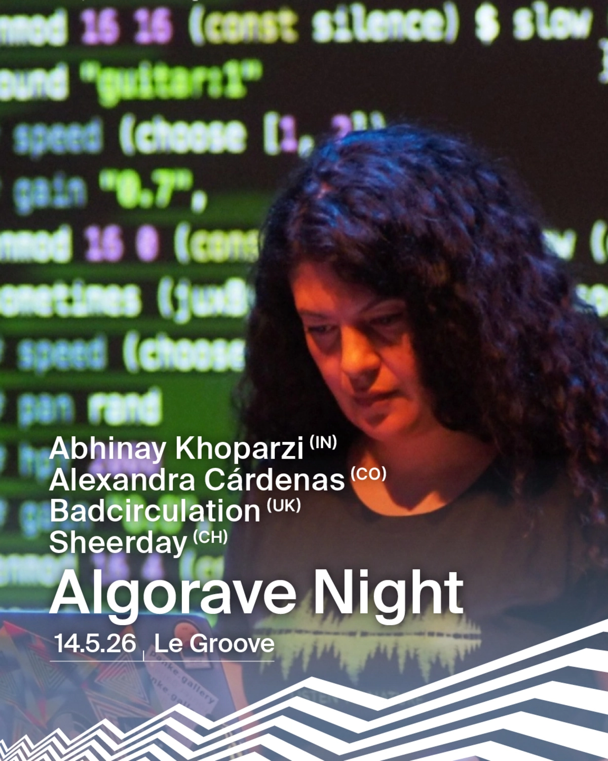 14 mai - L’Algorave, qu’est-ce que c’est ? Algo + rave : une expérience où le live coding transforme des lignes de code en musique électronique en direct, entre expérimentation et énergie dancefloor. 14 mai, Mapping Festival, Le Groove, Genève :L’Algorave, qu’est-ce que c’est ? Algo + rave : une expérience où le live coding transforme des lignes de code en musique électronique en direct, entre expérimentation et énergie dancefloor.19h - 21h : Restitution du Workshop WEAR IS MY LED (11 - 14.05, Le Groove - billetterie sur mappingfestival.com) de l’équipe MadMapper, défilé de mode dévoilant le travail réalisé pendant 4 jours. (Free access)21h30 - 23h : Abhinay Khoparzi (IN) – Artiste et technologue créatif, figure clé de la scène électronique expérimentale indienne, Khoparzi a cofondé Algorave India en 2018, un collectif dédié à la promotion du programming comme forme d’art performatif. 23h - 00h30 : Alexandra Cárdenas (CO) – Artiste originaire de Bogota basée à Berlin, explorant la musicalité du code à travers des performances de live coding immersives et expérimentales.00h30 - 2h : badcirculation (UK) – Composé d’Antonio Roberts (hellcatfood) et Maria Witek (mxwx), ce duo utilise TidalCycles pour générer une musique électronique algorithmique orientée club et improvisée en temps réel.2h - 5h : Sheerday (CH) & VJ Jojiflex (CH) – Activiste de la scène underground depuis 1995, Sheerday propose des DJ sets hautement psychédéliques et groovy, de psy techno, minimal et dark progressive. Le tout sera enveloppé par les visuels de VJ Jojiflex.TARIFS - Dès 21h :Tarif plein : CHF 22.-Tarifs Réduit : CHF 15.-Tarif “20 ans, 20 Francs” : CHF 13.-INFOS PRATIQUESBilletterie en ligne (réservation conseillée)Ouverture des portes : 19h00Début soirée : 21h30Rue des Gazomètres, 9 - 1205 GenèveTram 14 - Arrêts Jonction ou StandBus 1, 80 - Arrêts Jonction, Village Suisse ou PalladiumParking à vélosParking des Gazomètres, David Dufour