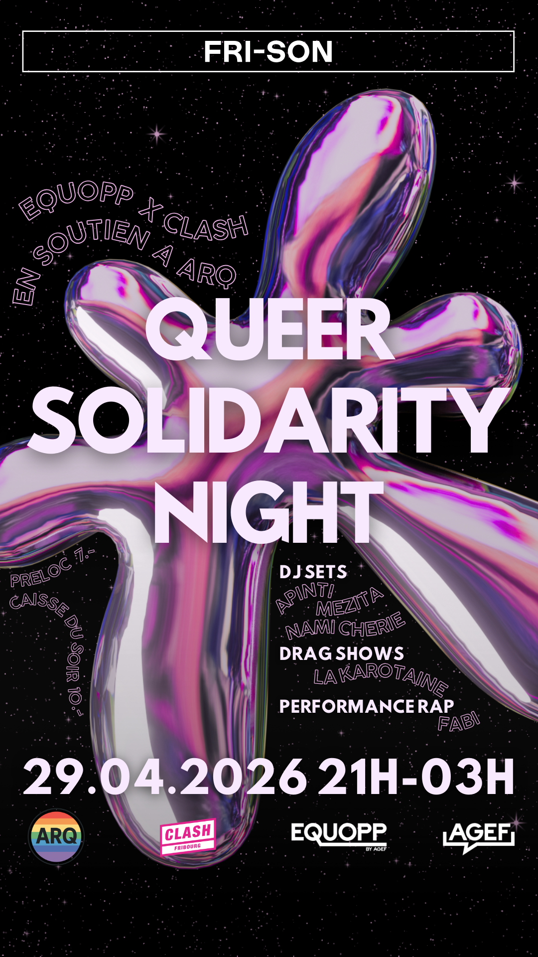 Une nuit queer et solidaire à Fribourg entre DJ sets, drag shows et énergie collective, Retrouvez toutes les informations sur Queer Solidarity Party, dès le 29.04.2026 à 21:00, Fri-Son, Fribourg sur Tempslibre.ch ainsi que tous les autres Concerts dans le canton de Fribourg et en Suisse Romande
