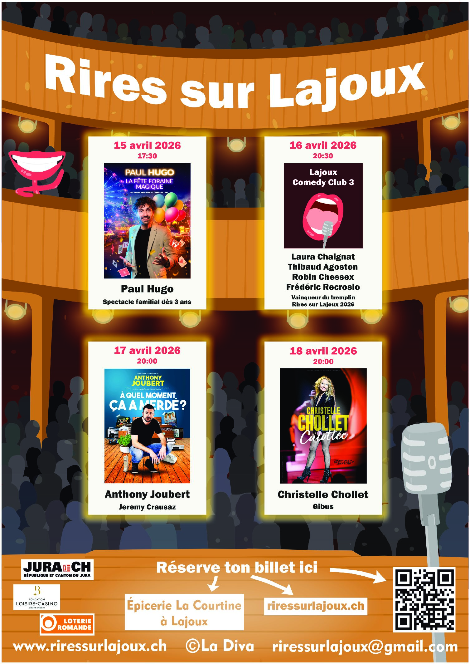 Le rendez-vous immanquable pour faire le plein de rires dans les Franches-Montagnes, Retrouvez toutes les informations sur Rires sur Lajoux, dès le 15.04.2026 à 17:30, Salle des Oeuvres, Lajoux sur Tempslibre.ch ainsi que tous les autres spectacles dans les régions du Jura et Jura bernois et en Suisse Romande